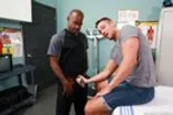 Doctor Aaron Trainer helps Aston Springs get his gag on.