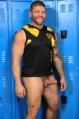 Hot tattooed bear fucks a tight ass in the locker room!