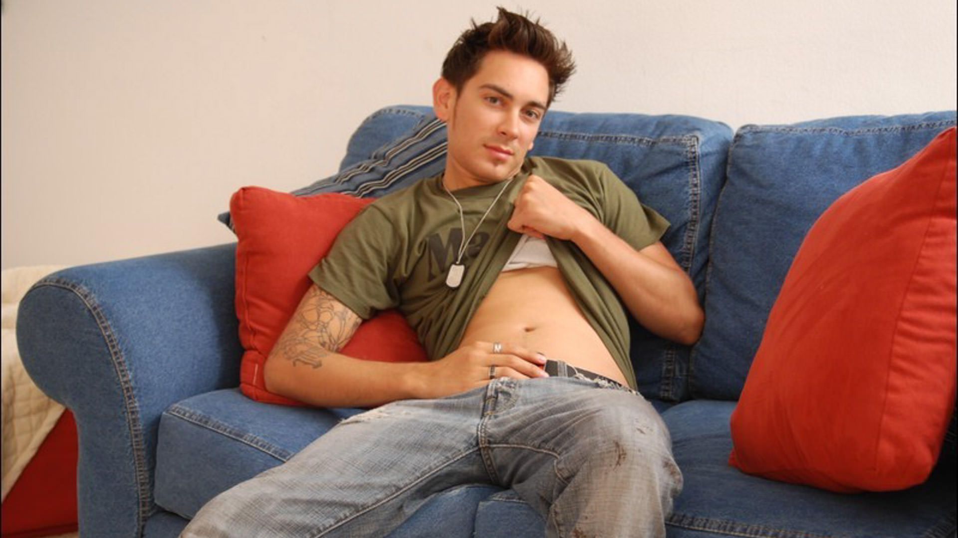 With his inked arms, tight jeans, bad-boy bed-head and a devilish soul patch, Malachi looks every inch the sinner he appears to be, despite the more pious origins of his name, which means 'my angel' in the Old Testament-although it is that nine inches of hissing cock he also sports that might just be something you have been praying for. Malachi has that laid-back manner that is always on the 'cool' setting, though that all changes when he enters the bedroom. 'I am very aggressive sexually, and I need a woman who can keep up,' he says with an evil glint in his eye. What we have our eye on is that bulge in his pants; does it contain a cock of near-biblical proportion his name alludes to? Of course, unwrapping the package is half the fun, and we don't want to be a flat tire on the party bus, but here is a little hint guys -get out the lube and select the largest size screen on your media player-Malachi has a lot to put on display.As he stands up and raises his shirt, some additional ink comes to view across his well-rounded pecs, though the real scene-stealer is how sexy those second-skin jeans cling to his narrow hips and flat, smooth waist. He licks his fingers, rubs his nipple, and likes the way it feels-he goes back for seconds. With a smoldering look that says, 'Come get me if you dare,' our languid Lucifer stares into the camera before turning around to display his most ironic ink of all: a pair of angel's wings between his shoulder blades. Facing us again, the mound in his pants has definitely increased in size. He snaps his thick leather belt, producing an evil echo that resonates through the room before dropping his jeans to show off a pair of tight, white, creamy ass cheeks. They say the devil finds work for idle hands, and when you take in the view as Malachi turns around, we know your hands will not be idle for long.Turning around, our little angel is definitely ready to go down the road of sin with his pitchfork leading the way. The shaft is long and lean, like the man himself with his cockhead still partially covered by remnants of his foreskin, indicating that despite already being a two-hander, there is still more growing room. As he spreads his legs wide, it is like an invitation to heaven that we are powerless to refuse. With his hands behind his head, as if by sheer will, Malachi makes his cock point up towards the sky with the now exposed head landing back against his flat abs, well above his navel. As he settles into the chair, his sack contracts into a tight, hard ball of red flesh as he gets down to the business of getting off. With the ink on his arms now a blur as he fists double-time, he embodies the fantasy of every skater, punk, and bad-boy you have ever lusted after, as he bites his lip and delivers a load that drips down the shaft, crosses his fingers, and puddles on the floor below. Malachi says when it comes to sex he is up for anything, so stay tuned guys, we have a special CircleJerkBoys.com test to find out just how true that is!