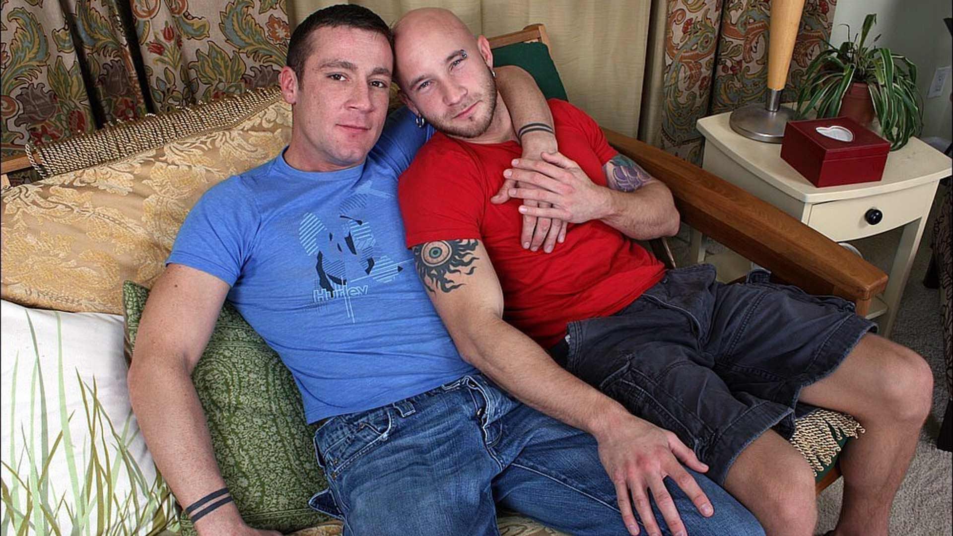 Back with us this week is a familiar Floridian we just can't get enough of these days, Mr. Drake Jayden. Drake was here a few weeks ago, when he got to explore Sexy Trent Diesel's 'backyard' with that 8' anal aerator. (Mmm, the visual alone!) Our fans wanted more, so the sexy 25 year-old from Central Florida is back, only this time we found him a hot, hung stud that's gonna be driving the plow into his fertile fields. Maybe fertile isn't the right word. What comes around goes around, and 28 year-old Bostonian Trevor Knight is here to help us out with that. Trevor is more than equipped for the task. Soon, Jayden will be much better acquainted with all that is Trevor. Both of these studs are busy boys, admitting they share the same thing on the top of their procrastination list: To stop smoking. They also have something else in common. When asked what they love to do, they both answer 'having sex'. 'I could do it here all day, and when I get home, if my boyfriend or whatever the case wants it-I'll do it again. Sounds like these two horny boys are gonna be all sorts of fun. We might need to get them naked first...By the time we start filming, Trevor's fly is undone, with these two are lip-locked as they move past 'break ice' to 'get you some' on the to-do list. They begin to explore each other. Both of their extra thick dicks are breathing a bit easier out of their confines. Trevor goes down to get a taste of Drake's cock as he bobs up and down along its growing length. Drake then has a go at Trevor's 9� python as it bobs and throbs with every swirl of Drake's tongue. Trevor lies back and spreads his legs wide as Drake settles in for an intense nursing session. He expertly sucks his cock all the way down to the hilt as Trevor coos and moans in delight. Trevor is naturally smooth. After getting his share of attention, he decides he wants to give Drake a little of the same. Drake holds Trevor's head as he gently bobs him on his meat. Trevor is all about oral, and he's only just begun. He gets Drake on all fours and moves in for the tossed salad appetizer. He dives into Drake's ass tongue first before going to town on that hairy ass he will soon claim. Drake is moaning in ecstasy as Trevor continues to eat that sweet hole and get it nice and ready for what's to follow. We assume you know what that is? After having Drake on his knees worshipping his cock some more to get it as hard as he can, Trevor moves his furry fuck buddy over to the couch where he begins the introductions. Soon enough, Trevor's fat cock is being introduced to Drake's tight ass. The two hit it off wonderfully, with Trevor's heavy low hangers joining in on the fun as they soon meet Drake's hungry ass-repeatedly! Trevor takes Drake's ass doggy style for a few before switching things up and sitting back on a chair, having Drake impale himself on that thick dick for the ride of his life. Drake is more than up for the fun. In no time, he's bouncing on that thick dick like a well-seasoned jockey. We don't know where he put it, but all 9�' have disappeared deep inside that smooth ass. Trevor slaps away at his ass as Drake grinds and bucks back on his cock. He's got it bad, and who can blame him? Drake moves up and slowly slides back down on that thick dick as he drives Trevor crazy with his muscular ass. They then move over to the couch, where Drake gets on his back and offers up that sweet ass for more. Trevor can't refuse, and is soon fucking his ass missionary. Trevor's fat cock is hitting Drake in all the right places. Sure enough, that does the trick. 'Feel that fuckin dick?' Trevor grunts, as he picks up the pace. 'Fuck me!' Drake grunts repeatedly, as Trevor literally fucks the cum out of him. He blasts all over his furry abs. Trevor follows suit as he hauls his cock out and blows all over Drake's cum drenched bod.